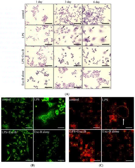 The method of generating osteoclast-like cells was based on that reported by Guo et al. and Islam et al. [24,45]. For osteoclast-like cell induction with LPS (10 ng/mL; Sigma-Aldrich, St. Louis, MO, USA), RAW 264.7 murine macrophages were harvested by pipetting, and seeded at 5 × 105 cells per well in a 6-well plate with DMEM (2 mM glutamine, 1 mM pyruvate, 4.5 g/L glucose, 50 mg/mL streptomycin, and 100 U/mL penicillin G) includingheat-inactivated foetal bovine serum (10%, Gibco fetal bovine serum product, Life Technologies Corporation, Grand Island, NY, USA) at 37 °C in a humidified 5% CO2: 95% air incubator for 1, 3, and 6 days. To evaluate the effect of Exc-B on LPS-induced osteoclastogenesis, cells were seeded onto slides and treated with 10 μM Exc-B for 1, 3, and 6 days. Haematoxylin and eosin staining was used to evaluate general and pathological changes in morphology visualized by microscopic examination (DM 6000B, Leica Inc., Leitz-Park, Wetzlar, Germany) using a microscope digital image output system (SPOT idea 5.0 Mp Colour Digital Camera, Diagnostic Instruments Inc., Sterling Heights, MI, USA). For in vitro analysis, Exc-B was dissolved in 100% dimethyl sulfoxide (DMSO) (clear). The experimental concentration of DMSO in DMEM was 0.1%. The control group in DMEM was 0.1% DMSO.