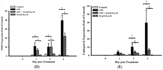 In a previous study, we found that Exc-B could inhibit inducible nitric oxide synthase (iNOS) and cyclooxygenase-2 (COX-2) gene and protein expression in LPS-induced RAW 264.7 cells in an in vitro model. Here, we used LPS-induced osteoclast-like cell formation to assess the anti-arthritic activity of Exc-B (10 μM) in vitro. Figure 1A shows the time course of LPS-induced osteoclast-like cell formation at Day 3 and Day 6 compared with the control (arrow). Multinucleated cell formation was visibly reduced when treated with LPS + Exc-B (10 μM). No obvious multinucleated cell formation could be observed from Day 1 to Day 6 when treated with Exc-B alone. Figure 1B,C show the TRAP protein expression and actin ring formation, respectively. Figure 1B indicates that LPS effectively upregulated TRAP protein expression, and Exc-B reduced TRAP protein expression in LPS-induced osteoclast-like cells at Day 6. Quantitative analysis of TRAP protein expression in LPS-induced osteoclast-like cells also showed that TRAP protein expression was reduced with Exc-B treatment at Day 6 (Figure S1A). Figure 1C indicates that LPS effectively promoted actin ring formation (arrow), and Exc-B reduced actin ring formation at Day 6. Quantitative analysis of the number of actin rings in LPS-induced osteoclast-like cells showed that these were decreased by Exc-B at Day 6 (Figure S1B). There was, however, no significant TRAP expression or actin ring formation with Exc-B treatment alone at Day 6 compared to the control (Figure S1). Furthermore, Figure 1 shows the MMP-9 and cathepsin K mRNA expression as determined using qPCR analysis. Figure 1D shows the changes in MMP-9 elicited by LPS-induced osteoclast-like cells at Days 0, 1, 3, and 6; whereby, MMP-9 mRNA expression was significantly increased at Days 1, 3, and 6 when compared to the control, and Exc-B significantly downregulated MMP-9 mRNA expression at Day 6. Similarly, cathepsin K mRNA expression significantly increased at Days 3 and 6 compared to the control, and Exc-B significantly reduced cathepsin K mRNA expression at Days 3 and 6 (Figure 1E). There was, however, no significant change in MMP-9 and cathepsin K mRNA expression with Exc-B (10 μM) treatment alone when compared to the control.