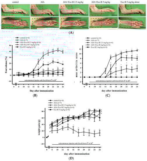 The adjuvant-induced arthritic (AIA) rat model in this study was based on that described by Sano et al. and Turull and Queralt [25,60]. In this study, 10 mg/mL heat-killed and lyophilized Mycobacterium butyricum (DIFCO Laboratories, Detroit, MI, USA) was suspended in incomplete Freund’s adjuvant (Sigma-Aldrich) maintained on ice. Rats were then immunized by adjuvant injection of 10 mg/mL M. butyricum in incomplete Freund’s adjuvant. On Day 0, rats were injected intra-dermally at the base of the tail with 0.1 mL of adjuvant, and the development of arthritis was monitored from Day 0 to Day 28. The rats were randomly divided into 5 groups: AIA group (n = 7), AIA + Exc-B group (2.5 mg/kg) (n = 6), AIA + Exc-B group (5 mg/kg) (n = 6), control group (n = 6), and Exc-B (5 mg/kg) group (n = 6).