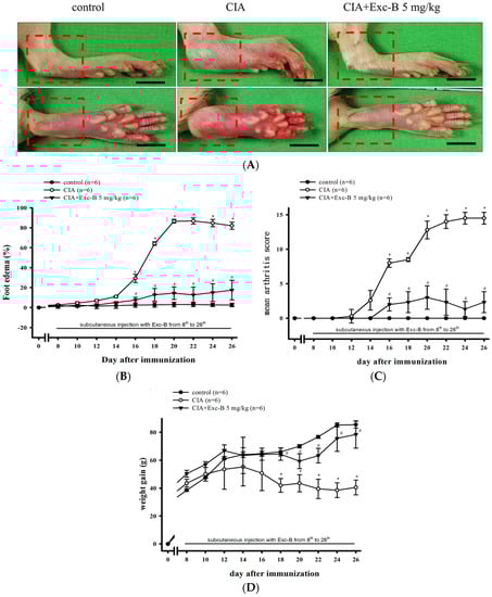 The collagen-induced arthritic (CIA) rat model used in this study was based on that described by Salvemoni et al. and Brand et al. [61,62]. Bovine type II collagen (MD Biosciences, St. Paul, MN, USA; catalogue no. 804001-lyo) was dissolved (2 mg/mL) in 0.1 M acetic acid at 4 °C overnight. Dissolved CII was stored at −80 °C until used. Animals were immunized with a homogenised emulsion of 1 part CII solution and 1 part incomplete Freund’s adjuvant at 4 °C. On Day 0, randomly selected rats were subcutaneously injected, at the base of the tail, with 0.1 mL of the emulsion, and the development of arthritis was monitored from Day 0 to Day 28. Rats were then randomly divided into 3 groups: CIA group (n = 6), CIA + Exc-B group (5 mg/kg) (n = 6), and control group (n = 6).