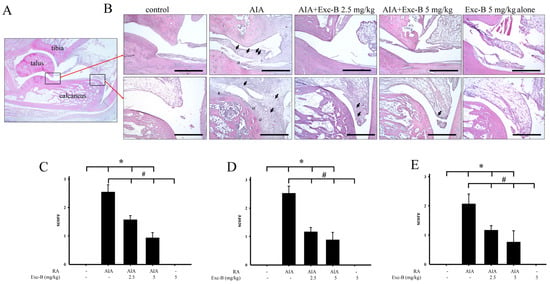 Histopathological assessments of the effect of Exc-B on the ankle joints in AIA rats. (A) Normal joint structure showing calcaneus-talus articulation with the distal tibia and normal synovial tissue in the control group; (B) Representative haematoxylin and eosin staining images of the ankle joint sections from the control, AIA, AIA + Exc-B (2.5 mg/kg), AIA + Exc-B (5 mg/kg), and Exc-B alone groups of similar areas as outlined by the boxes in the image of the normal joint structure. The AIA group exhibits synovial inflammation (arrows), bone erosion (b), and cartilage destruction (a). The representative histopathological scores for: synovial inflammation (C); cartilage destruction (D); and bone erosion (E) were assessed in ankle joints of the control, AIA, AIA + Exc-B (2.5 mg/kg), AIA + Exc-B (5 mg/kg), and Exc-B groups. Scale bar = 200 μm. Values reflect the mean ± SEM for each group. n = 6 rat per group. The data were analysed by one-way analysis of variance (ANOVA) followed by the Student–Newman–Keuls post hoc test. * p < 0.05, significantly different from the control group; # p < 0.05, significantly different from the AIA group.