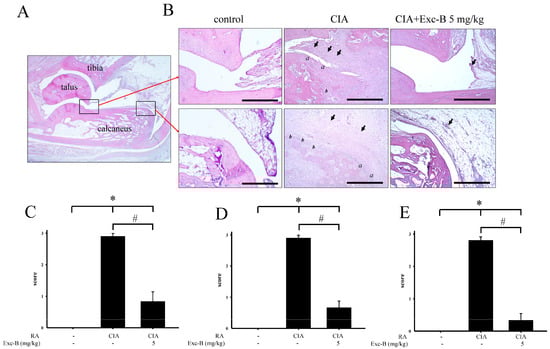 Histopathological assessments of the effect of Exc-B on the ankle joints in CIA rats. (A) Normal joint structure showing calcaneus-talus articulation with the distal tibia and normal synovial tissue in the control group; (B) Representative haematoxylin and eosin staining images of the ankle joint sections from the control, CIA, and CIA + Exc-B (5 mg/kg) groups in similar areas as outlined by the boxes in the image of the normal joint structure. The CIA group exhibits synovial inflammation (arrows), cartilage destruction (a) and bone erosion (b). The representative histopathological scores for: synovial inflammation (C); cartilage destruction (D); and bone erosion (E) were assessed in ankle joints of the control, CIA, and CIA + Exc-B (5 mg/kg) groups. Scale bar = 200 μm. Values reflect the mean ± SEM for each group. n = 6 rat per group. The data were analysed by one-way analysis of variance (ANOVA) followed by the Student–Newman–Keuls post hoc test. * p < 0.05, significantly different from the control group. # p < 0.05, significantly different from the CIA group.