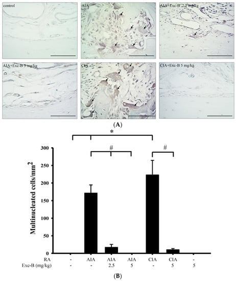 Effect of Exc-B on TRAP-positive multinucleated cell formation in vivo. Representative high-power field (400×) magnifications of specimens (A) from the: control; AIA; CIA; AIA + Exc-B (2.5 mg/kg); AIA + Exc-B (5 mg/kg); and CIA+ Exc-B (5 mg/kg) groups. The CIA and AIA groups show the TRAP-positive multinucleated cells (arrows) in the ankle joints sections. Quantitative analysis of the number of multinucleated cells (B). Values reflect the mean ± SEM for each group. Scale bar = 50 μm. n = 6 rat per group. The data were analysed by one-way analysis of variance (ANOVA) followed by the Student–Newman–Keuls post hoc test. * p < 0.05, significantly different from the control group; # p < 0.05, significantly different from the AIA or CIA group.