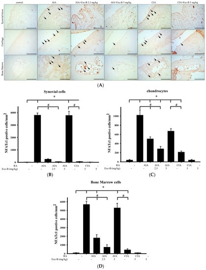 To investigate the effect of Exc-B on the number of NFATc1 positive cells, ankle joint sections were stained for NFATc1—a key transcription factor for osteoclast differentiation. Figure 7 shows the distribution of NFATc1 immunoreactivity in the ankle joint sections from the control, AIA, CIA, AIA + Exc-B (2.5 mg/kg), AIA + Exc-B (5 mg/kg), CIA + Exc-B (5 mg/kg), and Exc-B (5 mg/kg) alone groups. NFATc1 immunoreactivity appeared to increase in the synovial tissue, cartilage, and bone marrow of the ankle joints in the AIA and CIA groups (arrow). In the AIA + Exc-B (2.5 mg/kg), AIA + Exc-B (5 mg/kg), and CIA + Exc-B (2.5 mg/kg) groups, the treatment significantly reduced NFATc1 immunoreactivity in the articular cartilage, synovial tissue, and bone marrow of the ankle joints. Quantitative analysis of NFATc1 positive cells in synovial tissue, articular cartilage, and bone marrow also show marked upregulation of NFATc1 immunoreactivity in the AIA and CIA groups (Figure 7B–D). However, Exc-B markedly inhibited the induced upregulation of NFATc1 positive cell expression in synovial tissue, articular cartilage, and bone marrow in the treated AIA and CIA groups. There was, however, no difference between the group treated with Exc-B (5 mg/kg) alone and the control group (Figure 7B–D).