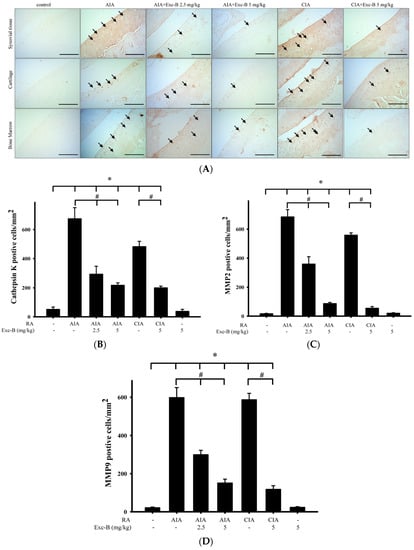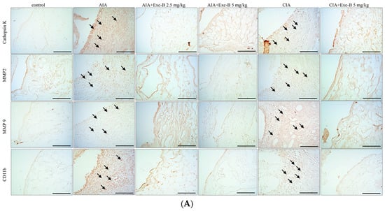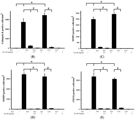 Figure 8 shows the distribution of cathepsin K, MMP-2, MMP-9, and CD11b in synovial tissues from the control, AIA, CIA, AIA + Exc-B (2.5 mg/kg), AIA + Exc-B (5 mg/kg), CIA + Exc-B (5 mg/kg), and Exc-B (5 mg/kg) alone groups. Cathepsin K appeared to increase in synovial tissues of the ankle joints in the AIA and CIA groups, while the AIA + Exc-B (2.5 mg/kg), AIA + Exc-B (5 mg/kg), and CIA + Exc-B (2.5 mg/kg) groups show significant inhibition of cathepsin K immunoreactivity in synovial tissues of the ankle joints. Quantitative analysis of the number of cathepsin K positive cells also showed marked upregulation of immunoreactivity (Figure 8B). However, Exc-B inhibited the upregulation of cathepsin K positive cells in the AIA and CIA groups. Similarly, MMP-2 appeared to increase in synovial tissues of the ankle joints in the AIA and CIA groups, and Exc-B significantly inhibited MMP-2 immunoreactivity (Figure 8A). Quantitative analysis of the number of MMP-2 positive cells in the synovial tissue also showed marked upregulation of immunoreactivity in the AIA and CIA groups, and a reduction in the number of MMP-2 positive cells with Exc-B treatment (Figure 8C). The immunoreactivity of MMP-9 could also be observed in the synovial tissues of the ankle joints from the AIA and CIA groups, and Exc-B treatment showed significant inhibition of MMP-9 immunoreactivity in the synovial tissue (Figure 8A). The same finding was also confirmed by quantitative analysis of MMP-9 immunoreactivity (Figure 8D). CD11b immunoreactivity was also evident in the synovial tissues of the AIA and CIA groups, and Exc-B treatment showed strong inhibition of CD11b protein expression in the synovial tissue (Figure 8A). Quantitative analysis of CD11b positive cells showed that Exc-B significantly reduced the number of CD11b positive cells (Figure 8E). There were no differences in the number of cathepsin K, MMP-2, MMP-9, and CD11b positive cells between the groups treated with Exc-B (5 mg/kg) alone and the control group (Figure 8B–E).