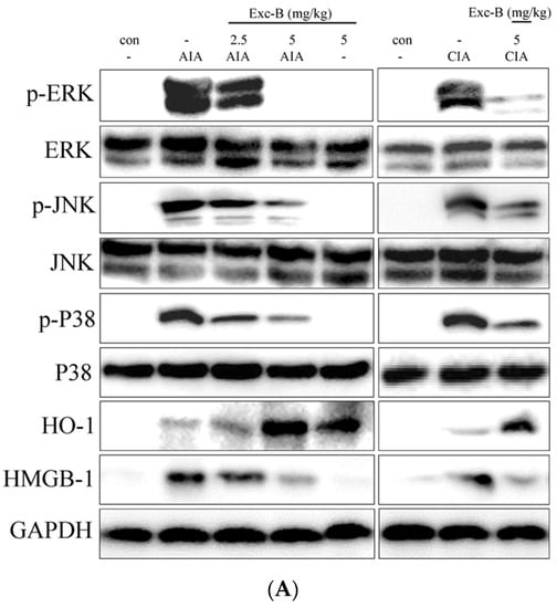 Western blot analysis was used to assess the effect of Exc-B and its possible mechanism of action in RA. Knee synovial tissues were collected from the control, AIA, CIA, AIA + Exc-B (2.5 mg/kg), AIA + Exc-B (5 mg/kg), CIA + Exc-B (5 mg/kg), and Exc-B (5 mg/kg) alone groups at Day 27 after immunization. The protein expression of p-ERK, ERK, p-P38, P38, p-JNK, JNK, HO-1, and HMGB-1 is displayed in Figure 10. The protein expression and quantitative result reveal that p-ERK, p-P38, p-JNK, HO-1, and HMGB-1 was upregulated in synovial tissues after Day 27 of immunization in comparison to the control group (Figure 10A). Subcutaneous injections of Exc-B (2.5 or 5 mg/kg) significant reduced p-ERK, p-P38, p-JNK, HMGB-1 protein expression, and upregulated HO-1 protein expression in synovial tissues of the treated AIA rats. Similar findings were also confirmed by Western blot analysis of tissues from the CIA + Exc-B (5 mg/kg) group (Figure 10A). There were, however, no observed changes in total ERK, JNK, or P38 in the synovial tissues. Administration of Exc-B 5 mg/kg alone also had no observable effects on the upregulation of p-ERK, p-P38, p-JNK, HMGB-1 protein expression, with the exception of HO-1 protein expression (Figure 10). Hence, Exc-B had a significant effect on the MAPK and HO-1/HMGB-1 pathways in synovial tissues after immunization.