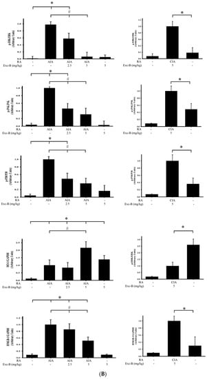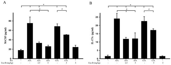 It is known that increases in M-CSF and IL-17A could lead to osteoclastogenesis. We, therefore, sought to measure the serum levels of M-CSF and IL-17A in the control, AIA, CIA, AIA + Exc-B (2.5 mg/kg), AIA + Exc-B (5 mg/kg), CIA + Exc-B (5 mg/kg), and Exc-B (5 mg/kg) alone groups at Day 27 after immunization. The level of these pro-inflammatory cytokines were analysed using a multiplex immunoassay. Consistent with the progression of RA and upregulation of TRAP-positive multinucleated cells, the levels of M-CSF and IL-17A in the AIA and CIA groups were significantly increased in the blood serum samples. However, treatment with 2.5 or 5 mg/kg Exc-B showed a marked decrease in the levels of M-CSF and IL-17A at Day 27 in AIA rats after immunization (Figure 11). Analogous results were observed in the treated CIA rats, in that the level of M-CSF and IL-17A decreased with 5 mg/kg Exc-B treatment (Figure 11). Thus, Exc-B could reduce osteoclastogenesis in RA via the downregulation of the pro-inflammatory cytokines M-CSF and IL-17A.