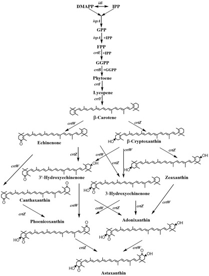- Choi, S.K.; Harada, H.; Matsuda, S.; Misawa, N. Characterization of two beta-carotene ketolases, CrtO and CrtW, by complementation analysis in Escherichia coli. Appl. Microbiol. Biotechnol. 2007, 75, 1335–1341. [Google Scholar] [CrossRef] [PubMed]