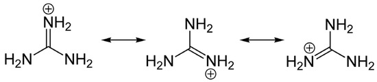 Structure and ionization of the guanidinium group. Saxitoxin (STX) has two guanidinium moieties and therefore two dissociation constants: pKa 8.22 for the 7,8,9 guanidinium group and 11.28 for the 1,2,3 group [12]. Tetrodotoxin (TTX) has only one guanidinium moiety, with a pKa of 8.76. These groups are protonated under physiological conditions, with a +1 charge [13].