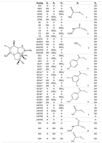Members of the STX group bear two guanidinium groups, whereas TTXs bear only one (Figure 1). This chemical characteristic confers either one or two positive charges to the molecules at physiological pH, which has important implications for their toxicity [38]. To date, the STX group is represented by more than 50 natural analogs, comprising the PSTs synthesized and metabolized by dinoflagellates and cyanobacteria, plus analogs created via biotransformation in other species [37] (Figure 2).