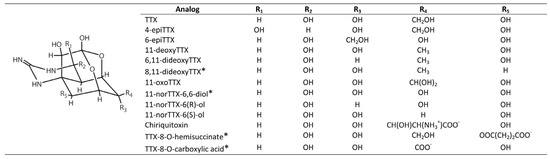 The TTX group comprises more than 25 natural analogs found among marine and terrestrial fauna and associated bacteria, plus synthetic analogs [24] (Figure 3).