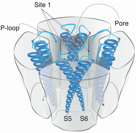 The binding site for guanidinium toxins is located in the α-subunit, specifically in the outer vestibule, a water-filled region formed by the four P-loops [82]. This is the binding Site 1, which is blocked specifically by guanidinium toxins (Figure 5). The affinity of these toxins in the NaV channel is 1:1; this means that one molecule binds to one ion channel, blocking it completely or partially [81,88].