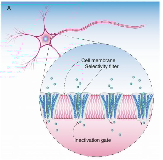 The NaV channels have a selectivity filter that allows the entry of Na+ ions and inhibits the entrance of other positively charged molecules/ions. This filter consists of one amino acid from each of the four domains (I–IV), respectively: Asp (D)–Glu (E)–Lys (K)–Ala (A) (called the DEKA motif) [39]; this DEKA motif comprises one residue from each of the four P-loop regions. Mutational and binding mapping studies led to the identification of the four main residues in the selectivity region located on the outer portion of the pore [81,82,83,84,85]. Three positions from the DEKA motif there is a ring of negatively charged amino acids (Glu (E)–Glu (E)–Met (M)–Asp (A) in mammals) that creates an electrostatic cloud to attract the Na+ ions into the pore [86]. Any alteration of the amino acids forming the DEKA moiety of the selectivity filter, or in this charged ring, can reduce the Na+ ion conductance across the pore [87].