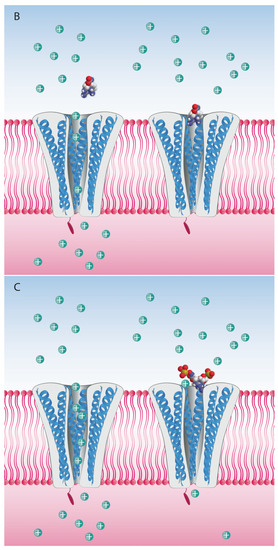 Schematic figurative representation of the NaV channels in a neuronal cell membrane. (A) Normal Na+ ion flux through the pores; (B) NaV channels blocked by STX molecules; (C) NaV channels partially blocked by N-sulfocarbamoyl C1 toxin. Here the steric hindrance effect and negative charge of the N-sulfo-groups are hampering the complete blockage of all pores, still allowing some Na+ ions to pass through the non-blocked pores.