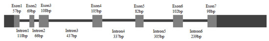 A 148 bp cDNA fragment of HpGLB1 was obtained from H. pluvialis cells by RT-PCR in this study. This fragment was homologous to the GLB1 of Chlamydomonas reinhardtii and Chlorella variabilis. The results showed that 5′-RACE PCR generated a 568 bp fragment, and 3′-RACE PCR generated a 702 bp fragment. Alignment assay indicated that the complete cDNA sequence of HpGLB1 was 1222 bp, including 621 bp coding sequence (CDS), 103 bp 5′ untranslated region (5′ UTR), and 498 bp 3′ untranslated region (3′ UTR). The length of the open reading frame of HpGLB1 in genomic DNA was 2123 bp, containing 7 exons and 6 introns (Figure 1). The length of introns varied from 66 bp to 437 bp. The sequence of HpGLB1 has been submitted to NCBI GenBank (Accession number: KT696441).