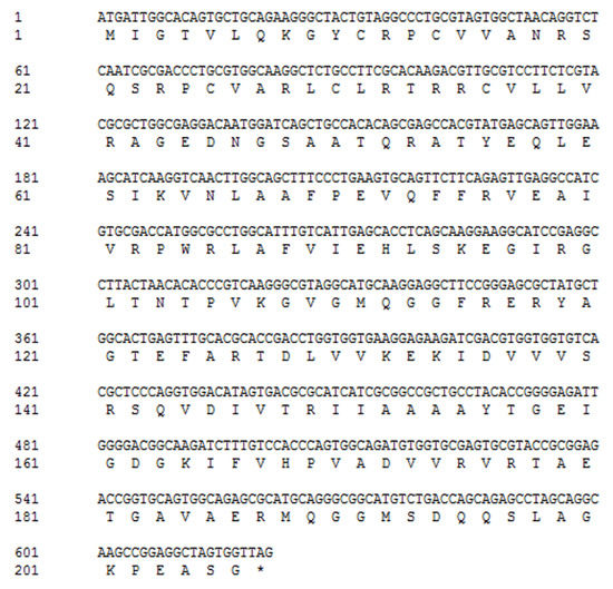 In order to generate the full length cDNA of the HpGLB1, this study used the SMART™ RACE cDNA Amplification Kit (Clontech, Mountain View, CA, USA) to perform 3′ and 5′ rapid amplification of the cDNA ends (RACE). Based on the obtained PCR results, the primers GSP1 and GSP2 (Table 1) were designed for the 5′ RACE and 3′ RACE. Subsequently, genomic DNA of H. pluvialis was isolated using the cetyltrimethylammounium bromide (CTAB) method [35]. Primers GLB1-F and GLB1-R were used to amplify genomic DNA of HpGLB1. As presented, all the PCR products were purified, cloned, and sequenced.