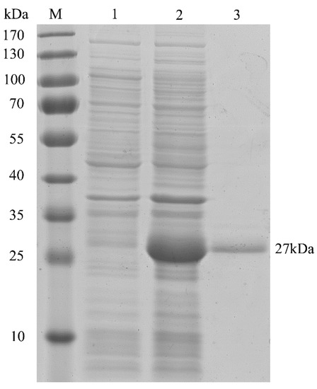 Encoded by HpGLB1 cDNA, the deduced full-length HpPII protein consisted of 206 amino acid residues (Figure 2). According to the Computer pI/Mw Tool, the calculated values of pI and Mw were 9.53 and 22.4 kDa, respectively. However, the molecular mass was approximately 27 kDa after HpPII was expressed and purified in E. coli BL21 (DE3) (Figure 3). This was the sum of the calculated Mw of HpPII (22.4 kDa) and N-terminal tag (4 kDa), and the latter was from the plasmid pET28a used for purification.