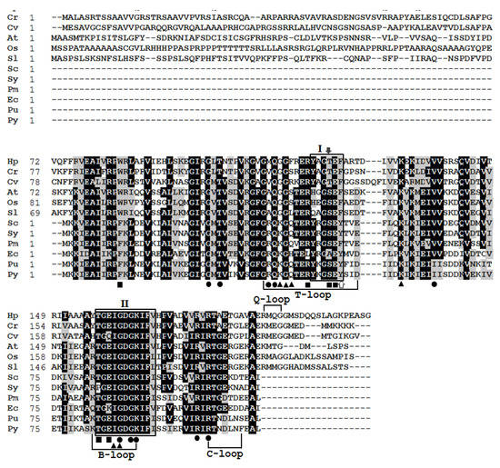 Alignment of the amino acid sequences of PII proteins among different organisms: Haematococcus pluvialis (Hp; AOO85416), Chlamydomonas reinhardtii (Cr; EDO96407.1), Chlorella variabilis (Cv; AHW46897.1), Arabidopsis thaliana (At; AAC78333.1), Oryza sativa (Os; NP_001054562.1), Solanum lycopersicum (Sl; NP_001234506.1), Synechocystis sp. PCC 6803 (Sc; WP_010873156.1), Synechococcus sp. (Sy; AAA27312.1), Prochlorococcus marinus (Pm; WP_036930683.1), Escherichia coli (Ec; CDZ21367.1), Porphyra umbilicalis (Pu; AFC39923.1), Pyropia yezoensis (Py; YP_536935.1). Residues in black represent >60% identity of aligned PII proteins. Amino acids shaded with grey display similar residues. Box I and box II are PII signature patterns I and II. The white arrow indicates the residue of the corresponding uridylylated threonyl-residue in proteobacteria. The black arrow indicates the residue of corresponding phosphorylated serine-residue in cyanobacteria. Black dots, squares, and triangles show the ATP-, NAGK-, and 2KG-binding residues, respectively.