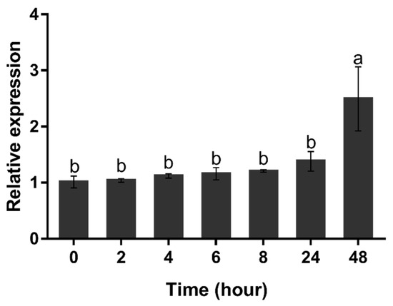 When H. pluvialis cells were exposed to nitrogen starvation, the expression level of HpGLB1 mRNA hardly changed from 0 to 24 h (p > 0.05) (Figure 6). However, its transcription level increased significantly at 48 h (p < 0.05).