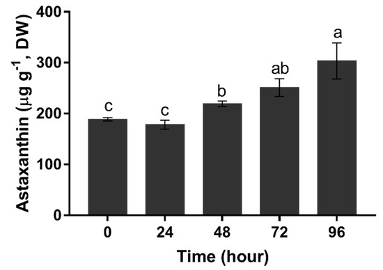 The content of astaxanthin was maintained below 200 μg g−1 in the first 24 h (p > 0.05). It started to increase at 48 h, and then continuously accelerated from 48 h (219.02 μg g−1) to 96 h (303.25 μg g−1) (Figure 7).