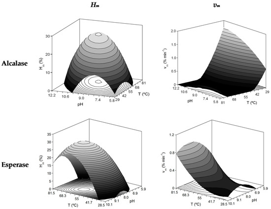 The case of vm was more heterogeneous; equations described different surfaces depending on the enzyme used, and the highest maximum rate of hydrolysis were achieved at high pH and low T for Alcalase and high T and pH = 8.65 for Esperase. Nevertheless, the reliability of the equations is much lower than in the case of Hm. This kinetic parameter (vm) is not applied in the studies concerning FPH since the modelling of FPH kinetics is habitually inexistent.