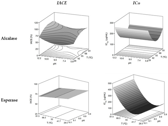 The theoretical surfaces show similar form in the IC50-response for both enzymes, that is, constant values for any level of pH and concave sheet with a minimum at 59.4 °C for Alcalase and 44.6 °C for Esperase (Figure 2 and Table 2). Thus, lower value of IC50 (higher activity) was found employing Esperase (83.6 μg/mL) than using Alcalase as catalyst (114.5 μg/mL). The values of Hm in the optimal conditions for maximizing IC50 can be calculated from the polynomial equations listed in Table 2 and were 25.9% and 23.1% for Alcalase and Esperase, respectively. As it was reported by [29], the presence of shorter peptides (obtained at high degrees of hydrolysis) in blue whiting hydrolysates lead to highest ACE-inhibitory activity (lower values of IC50); thus, our results are in concordance with that assumption: high Hm values, but not the highest, generated almost the best bioactivities (lower IC50 values and levels of IACE greater than 75%).