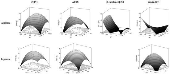 The outcomes of DPPH and ABTS for both enzymes were quite similar: convex domes were the 3D-surfaces expected (Figure 3) due to the negative terms obtained for the quadratic effect of T and pH (Table 3).