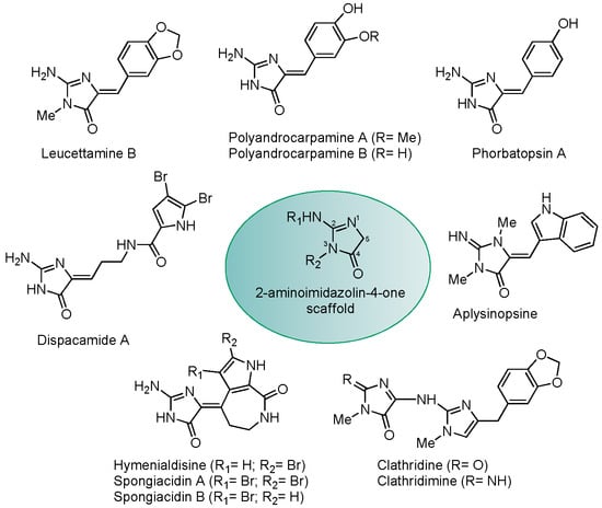 Structures of a selection of marine natural products sharing the 2-aminoimidazolin-4-one scaffold.