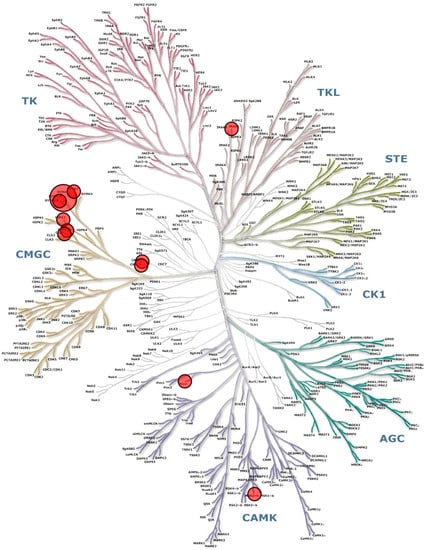 Aplysinopsine, dispacamide, clathridine and clathridimine were essentially inactive in the kinase panel. As expected [6], leucettamine B was modestly active (sub-micromolar IC50 values), and leucettine L41 was potent on members of the DYRKs and CLKs families. Again, little inhibitory activity was detected with kinases from unicellular parasites. Finally, both polyandrocarpamines A and B were found to display significantly selective inhibitory effects on DYRKs and somewhat less on CLKs (Table 1). To investigate the selectivity of polyandrocarpamines, polyandrocarpamine A was screened on the large-scale DiscoveRx KinomeScan panel (Figure 2, Supplementary Table S4). This interaction assay provides a semi-quantitative scoring view of the affinity of a compound for any of 442 human kinases [35]. This comprehensive screening approach confirmed the rather good selectivity of polyandrocarpamine A for DYRKs, and detected additional affinity for CSNK2A1/A2, CLK1/4 (Table 2).