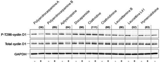 To confirm the effects of the active products on native DYRK1A in a cellular context, we made use of a SH-SY5Y neuroblastoma cell line expressing human DYRK1A [36] and antibodies directed against cyclin D1 phosphorylated at Threonine 286, a reported DYRK1A phosphorylation site [36,37] (Figure 3). SH-SY5Y-DYRK1A cells were exposed for 24 h to each product (30 μM, except for hymenialdisine and leucettine L41, which were tested at 3 μM), cells were harvested and their proteins resolved by SDS-PAGE, followed by Western blotting with antibodies against P-Thr286-cyclin D1, total cyclin D1 and GAPDH (loading control) (Figure 3). Phosphorylation of cyclin D1 at Thr286 was partially inhibited by polyandrocarpamine A (better than polyandrocarpamine B, leucettine L41 and hymenialdisine, confirming the potent effects on DYRK1A in a cellular context.