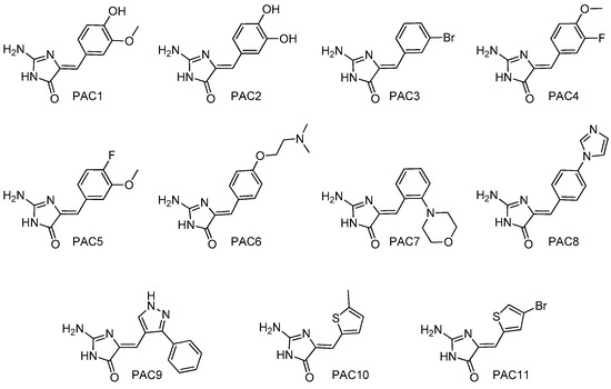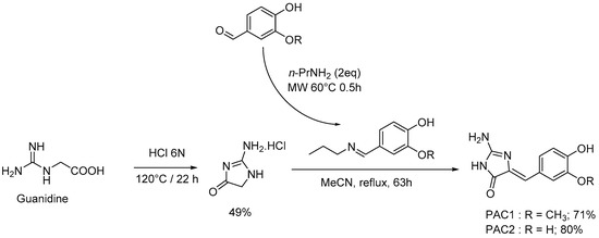 The synthesis of polyandrocarpamines A & B (PAC1 and PAC2) was performed from corresponding benzaldehyde derivatives, n-propylamine and 2-aminoimidazolin-4-one, the preparation of which was previously described in literature [53] (Figure 5). Guanidine (2.95 mmol, 1 eq) and HClaq 6N (9 mL) were heated at 120 °C for 22 h. Water was removed under vacuum and the crude product was solubilized in hot ethanol (9 mL). Diethylether (6 mL) was added, then the mixture was cooled to 0 °C. After 6 h, filtration was performed and the 2-aminoimidazolin-4-one was isolated as a white powder with a 49% yield. RMN 1H (D2O): δ 4.18 (s, 2H, H-1); RMN 13C (D2O): δ 48.5 (C-1); 174.9 (C=O); [M − HCl]+ = 99.0427 (99.0433 C3H5N3O); F = 200–202 °C. PAC1 and PAC2 were then produced by mixing the corresponding benzaldehyde (vanillin or catechaldehyde 1.48 mmol, 1 eq) with n-propylamine (2.95 mmol, 2 eq). The imine formation was performed under microwave irradiation at 60 °C for 30 min (maximized authorized power 60 W). Acetonitrile was added to the crude imine with 2-aminoimidazolin-4-one (1.48 mmol, 1 eq), and the mixture was stirred at reflux for 63 h. The solvent was removed under reduced pressure.