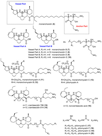 Monanchora, of the order Poecilosclerida and the family Crambeidae, is one of the richest sources of MGAs, especially complex polycyclic guanidines, such as crambescidins, ptilomycalins, fromiamycalins, celeromycalins, batzelladines, monanchomycalins, monanchocidins, normonanchocidins, neofolitispates, etc. Most of the recently reported MGAs were derived from this genus, with a wide range of biological activities such as cytotoxic, antimicrobial, antimalarial, and anti-HIV properties [12].