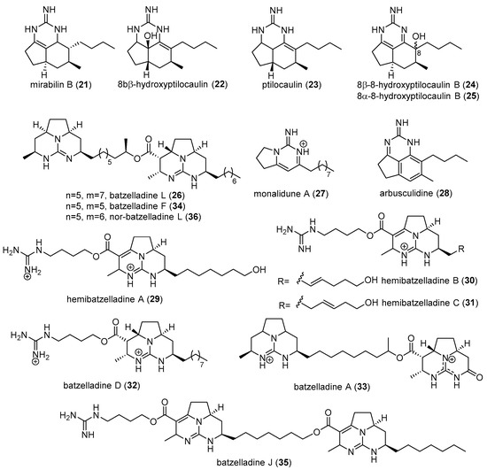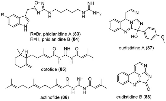 - Berlinck, R.G.S. Natural guanidine derivatives. Nat. Prod. Rep. 2016, 12, 1347–1448. [Google Scholar]