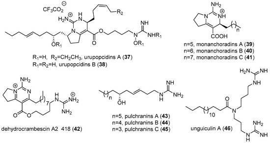 Bicyclic MGAs have been less frequently reported from Monanchora sponges in recent years (Figure 4). Other than the above-mentioned monalidine A, urupocidins are the represented bicyclic MGAs. They comprise a 5,6-fused cyclic guanidine ring system, which is connected to three aliphatic side chains at C-10, C-14, and C-15 positions. The C-14 side chain is linked to a terminal acyclic guanidine group. Urupocidins A and B (37 and 38) were first isolated by Makarieva and co-workers from the deep sea sponge M. pulchra near Urup Island at a depth of 183 m in 2014 [25]. Urupocidin A (37) was found to increase nitric oxide production in murine macrophages by inducing iNOS (inducible nitric oxide synthase) expression at 10.0 and 1.0 μM concentrations. In 2016, except for the above-mentioned pentacyclic MGAs, Ali and co-workers isolated four new bicyclic ones, monanchoradins A–C (39–41), and dehydrocrambescin A2 418 (42), from the French Polynesian Monanchora n. sp. sponge [18]. The structures of these compounds are less complex than those of urupocidins, with the similar cyclic ring system linked to only one aliphatic side chain. All four compounds were tested for cytotoxic activities against KB tumor cell lines, and 39 and 42 showed strong activities with IC50 values of 7.7, and 0.1 μM, respectively.