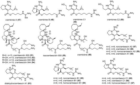 Crambe, of the order Poecilosclerida and the family Crambeidae (the same as Monanchora), has the origin as well-known MGAs such as crambescins and crambescidins. Crambe crambe is a red marine sponge, mainly distributed in the western Mediterranean Sea. Braekman and co-workers completed the first chemical study of this sponge in 1990 and 1992 [28,29], leading to the discovery of crambines A (47, 5,6-fused bicyclic MGA), B (48, 5,6-spiro bicyclic MGA), C1 (49), and C2 (50). It is worth mentioning that 49 and 50 are rare monocyclic MGAs. Meanwhile, the groups of Braekman and Rinehart discovered the well-known polycyclic MGAs, crambescidins 800 (51), 816 (52), 830 (53), 844 (54), isocrambescidin 800 (55) and crambidine (56) [30,31], which attracted a lot of attention because of their total synthesis and biological studies (Figure 5). In recent years, the chemical investigation of sponges of the genus Crambe was not as frequent as Monanchora, which might be due to the previous intensive study of this genus and also because of its limited distribution. There is only one report on the chemical reinvestigation of Crambe by the French group of Thomas in 2012, and one biological study was conducted by the Spanish group of Botana in collaboration with Thomas in 2015. Thomas and co-workers isolated 11 crambescin derivatives (57–67), and crambescidin 816 (52) (Figure 5), from the Villefranche-Sur-Mer (France) at 10–20 m depth [32]. The 11 crambescins can be divided into three types. The first type, including 57–61, is of a crambescin A skeleton, which is characterized by a 5,6-fused bicyclic ring system connected to one aliphatic side chain at the C-13 position and another one with a terminal guanidine group at the C-7 position. Compounds 62–64 represent the second type of crambescin B skeleton, featured by a [4,5]decane spiro-ring system with similar side chains as crambescin A. The last type, exemplified by 65–67, is from the crambescin C family, with a monocyclic guanidine ring linked to two side chains. The absolute configurations of compounds 57, 63 and 67 were determined by the TDDFT (time-dependent density functional theory) ECD (electronic circular dichroism) method. All the compounds were tested for their cytotoxicity against cortical neurons, with the known one 52 found to be the most toxic. In fact, crambescidins have been widely biological investigated, while there are not many biological reports on crambescins. Thus, Botana and co-workers cytotoxically examined crambescins A1 (60) and C1 (66) against human hepatoblastoma cell HepG2, including mechanistic studies, such as proliferation, apoptosis, and antioxidant activities [33]. The results revealed that 66 was able to induce MTs (metallothioneins) transcription and synthesis in HepG2 cell lines, protecting cells from oxidative damage at concentrations that retained cell viability. Such an observation provided the first comprehensive method regarding the various bioactivities of crambescins on tumor cells and gave a biological clue for the future investigation of such compounds.