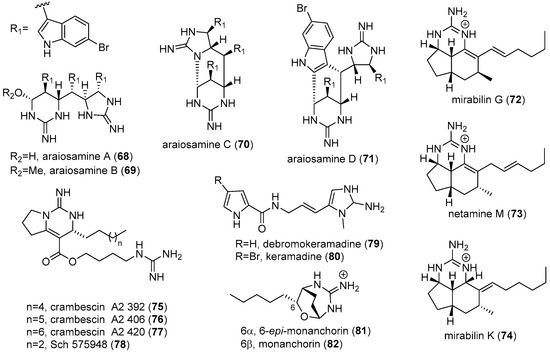 Although numerous complex MGAs were obtained from Monanchora and Crambe, their diversity is not that wide. Marine chemists turned to the chemical investigation of other sponges from different locations such as those from the genus Clathria in Vanuatu, Halichondria in Okinawa, Pseudaxinella in Bahamas, Acanthella in Australia, Agelas in Solomon Islands, etc. In 2011, Wagoner and co-workers isolated four new tris-bromoindole cyclic guanidine alkaloids, araiosamines A–D (68–71) (Figure 6), from the marine sponge, Clathria (Thalysias) araiosa, collected from Vanuatu [34]. The structures of these compounds are totally different from the aforementioned MGAs. They comprise three bromoindole rings, connecting to six-membered and five-membered guanidine rings. The authors tested the phenotypic effects against zebrafish embryos, antibacterial activity against Staphylococcus aureus, and HIV infection of the araiosamines, without showing any significant activities. Nevertheless, araiosamines represent a novel scaffold of MGAs discovered from marine sponges. Typical tricyclic MGAs, mirabilin G (72), netamine M (73), and mirabilin K (74), have been obtained from the Southeastern Australian sponge Acanthella Cavernosa [35]. These mirabilin derivatives were evaluated for activity against tumor suppressor PDCD4 (Programmed cell death protein 4), of which 72 and 73 displayed strong inhibitory activities in the cellular degradation of PDCD4 with EC50 values of 1.8 and 2.8 μg/mL, respectively. To the authors’ best knowledge, 72 and 73 are the first MNPs reported to stabilize PDCD4 under tumor promoting conditions. Bicyclic MGAs of the crambescin skeleton, exemplified by crambescins A2 392 (75), 406 (76), 420 (77), and Sch 575948 (78), were discovered in the Bahamas sponge Pseudaxinella reticulate collected in Sweetings Cay at a 17-m depth (Figure 6) [36] by Molinski and co-workers in 2015. All the compounds were tested for antifungal activity against the pathogenic strains Candida albicans and Cryptococcus sp., with MIC50 ranging from 1.1 to 39 μg/mL and MIC90 from 2.3 to 59 μg/mL. The length of the alkyl side chain was responsible for the variation of activities. In the same year, the group of Ali and co-workers investigated a Pacific sponge Agelas cf. mauritiana from Solomon Islands at 18–30 m depth, resulting in the isolation and elucidation of debromokeramadine (79) (Figure 6) [37]. Compound 79, belonging to the pyrrole-2-aminoimidazole (P-2-AI), is a debromo product of keramadine (80), which was isolated by Kobayashi and co-workers from an Okinawan Sea sponge Agelas sp. [38]. The authors achieved total synthesis of 79 and 80 through a key regioselective oxidative addition of a guanidine derivative on N-acylpyrrole dihydropyridines. This method was applied for the synthesis of the analogs of 79, which allowed the further biological study of P-2-AI derivatives. In 2016, two 6,7-fused bicyclic MGAs, 6-epi-monanchorin (81) and its known isomer monanchorin (82) (Figure 6), were isolated by Yamazaki and co-workers from the Okinawan marine sponge Halichondria panicea at Iriomote Island in Japan [39]. Neither compound exhibited activity against M. segmatis at 20 μg/disc nor cytotoxicity against cancer cell lines at 10 μM.