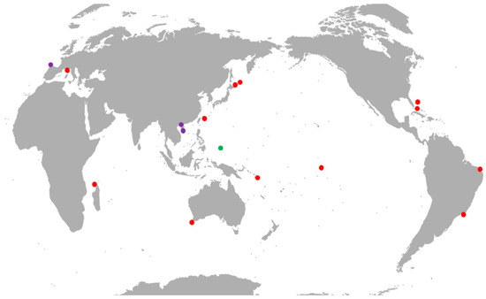 The global distribution of the MGA-containing marine organisms, which have been chemically investigated since 2010 (red means sponges, violet means mollusks, green means ascidians).