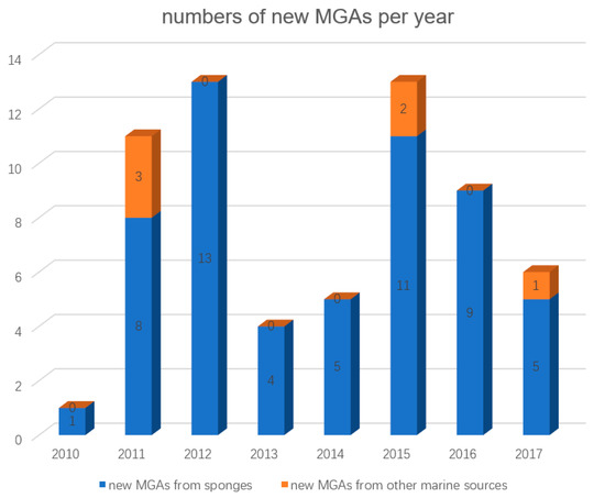 In summary, although guanidine containing metabolites are extremely rare in nature, more than 60 MGAs have being isolated since 2010 from various marine sources located all over the global ocean (Figure 8), with sponges as the most frequent origins. As shown in Figure 9, only 3, 2 and 1 MGAs were isolated from other marine sources, including mollusks and ascidians, in 2011, 2015, and 2017, respectively. These data indicated that marine sponges are the main sources of MGAs in recent years, which should be attributed to their relatively larger amount and ease of collection.
