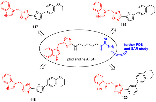 In light of various total syntheses and biological studies, the phidianidine scaffold became popular in both synthetical and biological communities. Our group has long been engaged in the design and function oriented synthesis (FOS) of phidianidine analogs towards more biological active compounds. The initial strategy was to keep the indole and oxadiazole skeleton but remove the long guanidine chain. Two series of such derivatives with various heterocycles to replace the guanidine chain were synthesized by using metal catalyzed couplings. A series of the analogs, exemplified by 117, and 118, showed considerable neuroprotective effects against amyloid-β25–35 (A β25–35)-, hydrogenperoxide (H2O2)-, and oxygen-glucose deprivation (OGD)-induced neurotoxicity in SH-SY5Y cells, with cell viability of 80–120%, comparable with the positive control [59]. Another series of derivatives, such as 119 and 120 (IC50 = 8.96 and 8.80 μM, respectively), exhibited significant PTP1B (ProteinTyrosine Phosphatase-1B) inhibitory activities towards anti-diabetes drug design [60]. The systematic FOS of phidianidine analogs by our group to further evaluate the function of the guanidine group is still ongoing on the basis of our previous results and with the aid of computer-assisted drug design (Figure 10).