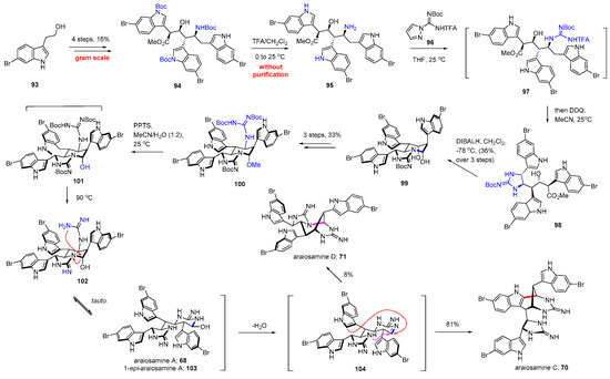 In detail, starting with 6-bromo-tryptophol (93), a first 4-step reaction performed well to produce 94 with approximate 16% overall yield. After obtaining the free amine 95 by treating 94 with TFA, a challenge pertaining to the installation of the first guanidine occurred. Several guanidinylation reagents were attempted and gave negative results, and finally N-Boc,N′-trifluoroacetyl-guanylpyrazole (96) was synthesized and enabled the reaction with 95 towards the intermediate 97. It was then treated by 2,3-dicyano-5,6-dichlorobenzoquinone (DDQ) to promote a “Yonemitsu-type” oxidation of the C-6 indole for a pivotal chemo- and stereoselective C-H functionalized cyclization to afford 98, which underwent DIBAL reduction to produce 99 with 36% yield over the three steps. 99 underwent oxidation, reductive amination, reduction, and second guanidinylation to obtain the key intermediate 100 with 33% global yield. Hydrolysis of 100 with pyridinium p-toluenesulfonate (PPTS) in MeCN/H2O at room temperature over 3 days yielded 101, which was heated over 90 °C to remove the Boc protecting groups to liberate 102. Intriguingly, 102 was found to exist in equilibrium with araiosamine A (68) and 1-epi-araiosamine A (103) via ring chain tautomerization, and the isolated 68 could revert back to a tautomeric mixture of 102 and 103 over several hours. According to the supporting information of Baran’s JACS paper [54], a continued heating of this mixture for 24 h yielded araiosamines C (70) and D (71) through the intermediate “pre-araiosamine” (104). Therefore, by using fantastic chemical reactions, Baran and co-workers achieved the total synthesis of araiosamines A, C and D in 11 formal steps with the overall yield of 1.94%, 1.57%, and 0.16%, respectively.