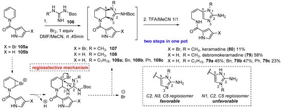 Interestingly, the authors created a flexible one-pot synthesis towards the two natural products (Scheme 3). They started from the previously described N-acylpyrrole-1,2 dihydropyridine 105, followed by a regioselective reaction, favorable for C2, N3, C5 regioisomer, with N-methyl-N′-Boc-guanidine (106) in the presence of 1 equiv bromine, giving the expected bicyclic products 107, 108, and 108a–c. An attempt to treat these regioselective intermediates under acid conditions led to the direct cleavage of the amino bond and the Boc deprotection towards the aim of natural products 79 and 80 in one-pot synthesis. By applying the same approach, the authors were able to synthesize a series of 79 analogs (79a–c). The authors intended to prepare more analogs for further biological evaluation and structure-activity relationship (SAR) analysis.
