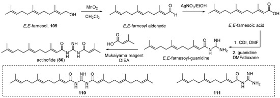 Immediately after the discovery of actinofide from the mollusk Actinocyclus papillatus [43], our group and Gavagnin’s group completed a four-step synthesis of this natural product (Scheme 4) and its analogs for further biological investigation. The total synthesis started with E,E-farnesol (109), which went through two-step oxidation, guanidinylation, and amidation to yield actinofide (86) and analogs in high quantities [43].