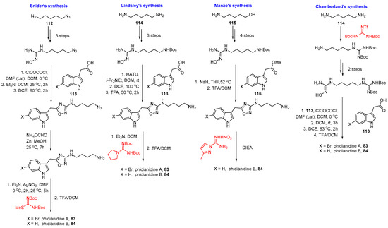 Snider and co-workers started with diazide 112 and indole-3-acetic acid (113), carried out via a key reaction for the construction of the 1,2,4-oxadiazole ring followed by late-stage guanidinylation, and finally installed the natural products in eight steps with 19% overall yield [53]. This paper was the first report of the total synthesis of phidianidines. Recently, Lindsley and co-workers reported the synthsis of phidianidines and their analogs, as well as their biological study, in ACS Chem. Neurosci. [56]. The synthetic method is similar as that of Snider, while 1,5-diaminopentane 114 was used as the starting material, the guanidinylation was also proceeded at a late state after the cyclization of the oxadiazole ring. This synthesis only consumed six steps with 39.9% and 21% overall yield for 83 and 84, respectively. Via the biological evaluation, 83 and 84 were found to be potent ligands for the μ-opioid receptor with high selectivity, since no activity against the δ- or κ-opioid receptors were observed, and both compounds exhibited weak partial agonist μ-opioid activity. They have also been found by the authors to be selective inhibitors of DAT (dopamine transporter), versus SERT (serotonin transporter) and NET (norepinephrine transporter). Interestingly, 83 and 84 were not cytotoxic against Human Embryonic Kidney 293 (HEK293) cells. Therefore, 83 and 84 could be further studied towards potent and selective ligands for CNS (central nervous system) targets of therapeutic relevance. The authors also synthesized some structural analogs of phidianidines, but no biological data are available for them. Soon thereafter, Manzo and co-workers started with 5-amino-1-pentanol (115) and methyl indole-3-acetate (116) and synthesized phidianidine B (84) in seven steps with 14% total yield [57]. Different from the above two methods, the late-stage guanidinylation of Manzo was achieved by using 3,5-dimethyl-1-pyrazolylformaminidium nitrate. In 2013, Chamberland and co-workers reported a concise synthesis of phidianidines A (83) and B (84) [58], featured by the construction of the guanidine group at the early-stage, before the formation of the oxadiazole ring. The total synthesis, starting from 1,5-diaminopentane (114), was accomplished, with 5.4% and 5.7% for 83 and 84, respectively.