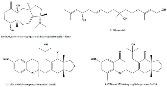 More than 50% of antileishmanial compounds isolated from macroalgae belong to the family of diterpenes (Prenylated guaiane, dolastane, secodolastane, xeniane, dolabellane, dichotomanes and meroterpenoids). These are largely distributed among the brown seaweeds of the Dictyotaceae family as major secondary metabolites with biological activities against a vast panel of pathogens, cancer cells and cardiovascular diseases [49,78,79,80,81].
