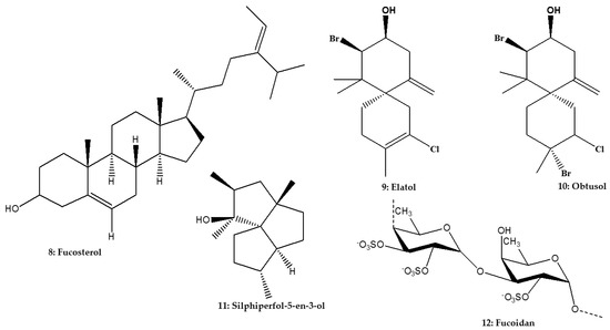 Among the sulfated polysaccharides screened, fucoidan (12, Figure 1), a polyanionic sulfated polysaccharide found in many brown algae was the most interesting. This compound showed an inhibitory effect on intracellular amastigote of L. donovani with 93% inhibition at 50.6 μg/mL. In vivo, a complete elimination of liver and spleen parasite burden was achieved at a dose of 200 mg/kg/day three times daily. Fucoidan was able to induce a protective response from the host by means of the production of cytokines and significant increment in the levels of reactive oxygen species and nitric oxide in infected macrophages, which may be involved in the observed reduction of the parasite multiplication [76]. Despite this promising potential, fucoidan, as a high-molecular-weight product has high hemorrhagic risk, poor solubility and bioavailability [82].