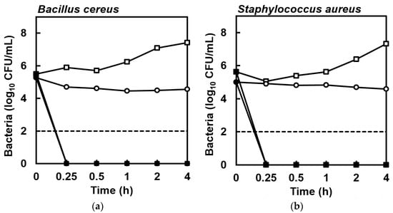 The susceptibility of B. cereus NCIMB 9373 and S. aureus Newman to EPA was assessed by broth micro-dilution according to Clinical and Laboratory Standards Institute protocols [,]. EPA demonstrated both growth inhibitory and bactericidal activities against B. cereus and S. aureus. The minimum inhibitory concentration (MIC) was 64 mg/L for EPA against both B. cereus and S. aureus, while the minimum bactericidal concentration (MBC) for B. cereus and S. aureus was 64 and 128 mg/L, respectively. In trials to determine kill kinetics at 128 mg/L EPA, no colonies formed by surviving cells were detected after plating 5 × 105 colony forming units (CFU)/mL suspensions of B. cereus and S. aureus in Mueller-Hinton (MH) broth at 15 min or at subsequent sample times (Figure 1). As expected, some cell division occurred in the control suspensions in MH broth during the 4-h incubation (Figure 1). This experiment was repeated for cell suspensions prepared in phosphate-buffered saline (PBS) to determine whether active bacterial growth was necessary for the killing activity of EPA, but again no colonies formed by surviving cells were detected within 15 min and there was little change in CFU/mL during the 4-h incubation in the control suspensions (Figure 1).