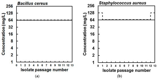 Next, to investigate the possibility to select experimentally for strains with reduced susceptibility to EPA quickly, B. cereus and S. aureus were serially passaged 13 times in the presence of sub-inhibitory concentrations of this fatty acid in the wells of a 96-well microtitre plate. At each sub-passage, the contents of the wells used to inoculate the subsequent cultures were stored at −70 °C in a cryogenic tube with 15% glycerol (v/v), so that the susceptibility of each passage isolate to EPA could be determined by MIC and compared to the parent strains. After passage of the B. cereus strain in sub-inhibitory concentrations of EPA, the isolates from each of 13 passages and the parent strain showed no change in susceptibility to EPA as all isolates had identical MIC and MBC values, indicating the lack of selection of B. cereus cells with reduced susceptibility to EPA (Figure 2). Similarly, the MIC values of the corresponding S. aureus passage isolates were the same as the parent strain, though the MBC value of each passaged isolate (except for the final passage isolate) was lower than the MBC of the parent strain (Figure 2). Still, there was no evidence for the selection of S. aureus cells with reduced susceptibility during repeated exposure to sub-inhibitory concentrations of EPA.