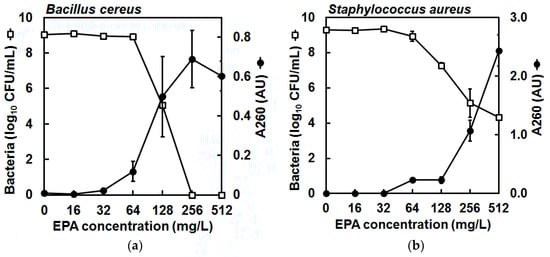 To assess bacterial membrane perturbation and increasing membrane permeability, leakage of 260-nm absorbing material was quantified from B. cereus and S. aureus cells in suspension after exposure to increasing concentrations of EPA for 30 min, according to a protocol modified from Carson et al. []. These measurements were performed concomitant with bacterial viability assessments by plating cell suspensions on agar. For this, EPA (solubilized in ethanol) was added to PBS and made up to 90 μL to give 16, 32, 64, 128, 256, and 512 mg/L (final volume concentrations after addition of inoculum below), while control tubes contained 90 μL PBS with ethanol concentrations corresponding to each of the respective EPA-containing tubes. Two negative control tubes contained PBS only (no EPA or ethanol). For 10 μL from each tube, A260 was determined on a NanoDrop 1000 spectrophotometer (ThermoScientific, Wilmington, DE, USA) and each of these values for the tube solutions served as the ‘blank’ when readings were to be taken again from each tube at 30 min. After this, to each tube was added 10 μL of bacterial suspension at 1.5 × 1010 CFU/mL, which had been prepared in PBS as described in Section 4.2, except that the cells were derived from a 500-mL shake flask culture (37 °C, 150 rpm, 24 h). Immediately, one of the negative control tubes was sampled to determine CFU/mL and the A260 of sterile-filtered supernatant. CFU/mL was determined by serial dilution and plating of 10 μL of suspension as described in Section 4.2, while the remaining 80 μL of the suspension was centrifuged (2000× g, 10 min). Then the supernatant was collected and passed through a 0.22-μm syringe filter (4 mm; Sterlitech, Washington, DC, USA), before the A260 of this filtrate was measured on the NanoDrop against its respective ‘blank’. Meanwhile, all other tubes were incubated (37 °C, 30 min). After incubation, the CFU/mL of unfiltered suspension and A260 of filtered suspension were determined for each tube as described above, however CFU/mL counts were performed only for the remaining negative control, each EPA-containing tube, and the tube containing the greatest volume of carrier solvent. Note that as the control incubations in the presence of carrier solvent (ethanol) showed the presence of only negligible quantities of A260-absorbing material in cell-free filtrates (data not shown), these A260 values were not subtracted from the A260 value of each respective EPA treatment reading. This experiment was repeated twice more, though CFU/mL was determined for only one of these further trials.
