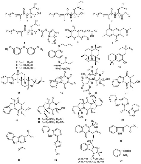 According to a comparison of the spectroscopic data of compounds 6–14 and 17–28 (Supplementary Figures S41–S58 and S75–S98) with literature reports, their chemical structures were identified as dichotone A (6) [13], diorcinol (7) [14], 3-O-methyldiorcinol (8) [14], 5,5′-oxybis(1-methoxy-3-methylbenzene) (9) [15], dibutyl phthalate (10) [16], butyl (2-ethylhexyl) phthalate (11) [17], (2aR, 5R, 5aR, 8S, 8aS)-2,2,5,8-tetramethyldecahydro-2H-naphtho[1,8-bc]furan-5-ol (12) [18], aspewentin A (13) [19], JBIR-03 (14) [20], dichotocejpin A (17) [21], didehydrobisdethiobis (methylthio) gliotoxin (18) [12], bisdethiobis (methylthio) gliotoxin (19) [10], 6-acetylbis (methylthio) gliotoxin (20) [12], haematocin (21) [10], pityriacitrin (22) [22], stellarine A (23) [23], perlolyrine (24) [24], fiscalin C (25) [25], epi-fiscalin C (26) [25], indolyl-3-acetic acid methyl ester (27) [26], and anthranilic acid (28) [27].