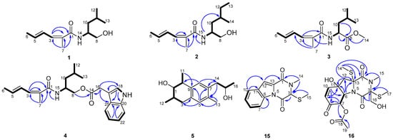 The 1H-1H COSY (bold line) and key HMBC correlations (arrows) of compounds 1–5 and 15–16.